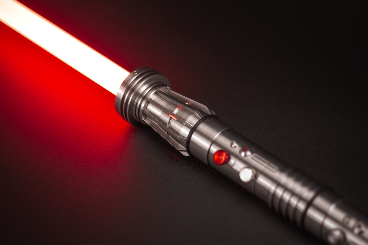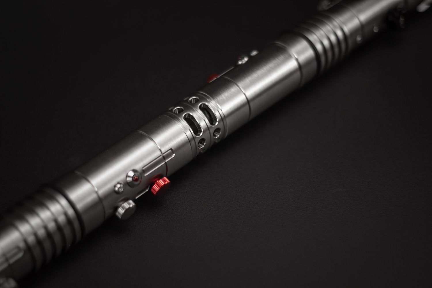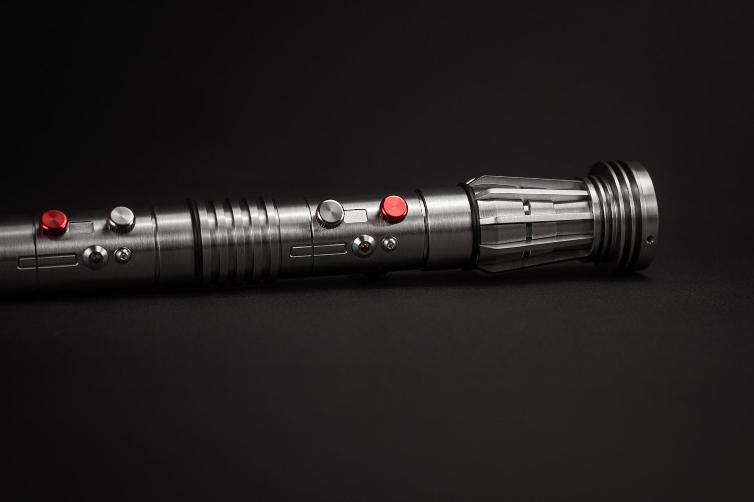 Un nuevo tipo de aleación con mayor dureza nos permitió darle un acabado cepillado sin que se raye fácilmente. También le da un color gris más oscuro lo cual lo hace resaltar aún más con sus detalles nuevos. Éste sable Élite es una réplica que cualquier coleccionista debe tener. Cuenta con nuevos botones y acabados minuciosos en toda la empuñadura. Ahora se podrá adaptar el segundo Sable de Maul a ésta empuñadura (Clone Wars) o dejarlo simétrico como en su primera aparición. Los sables pueden desmontarse para hacerse independientes.