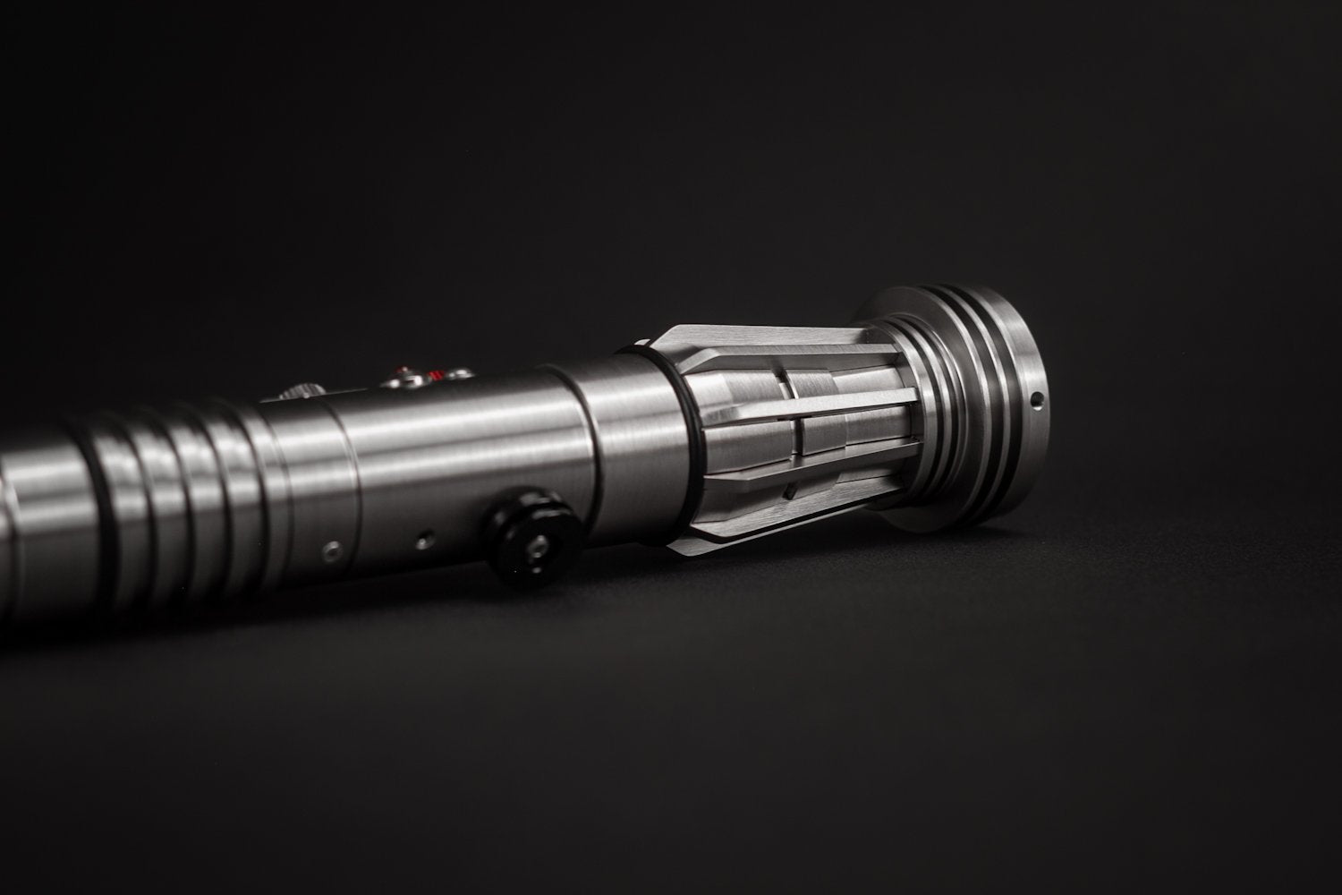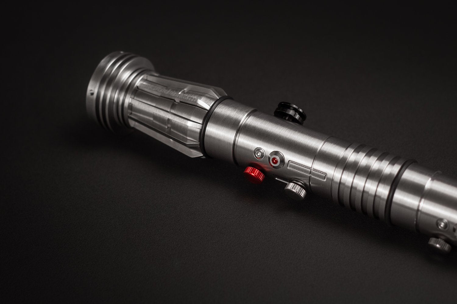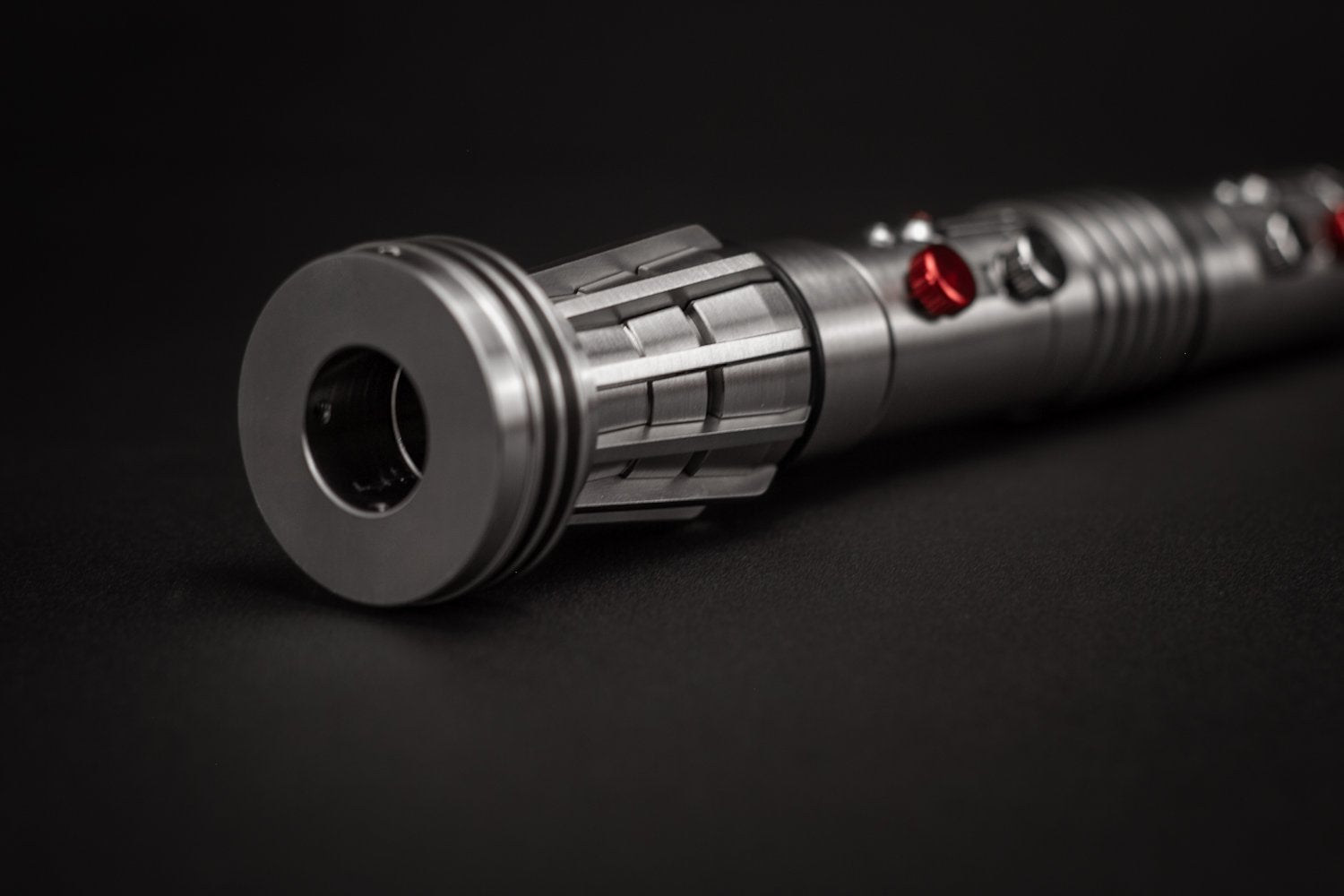 Un nuevo tipo de aleación con mayor dureza nos permitió darle un acabado cepillado sin que se raye fácilmente. También le da un color gris más oscuro lo cual lo hace resaltar aún más con sus detalles nuevos. Éste sable Élite es una réplica que cualquier coleccionista debe tener. Cuenta con nuevos botones y acabados minuciosos en toda la empuñadura. Ahora se podrá adaptar el segundo Sable de Maul a ésta empuñadura (Clone Wars) o dejarlo simétrico como en su primera aparición. Los sables pueden desmontarse para hacerse independientes.