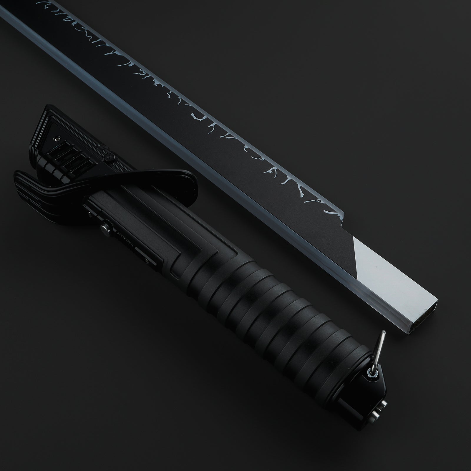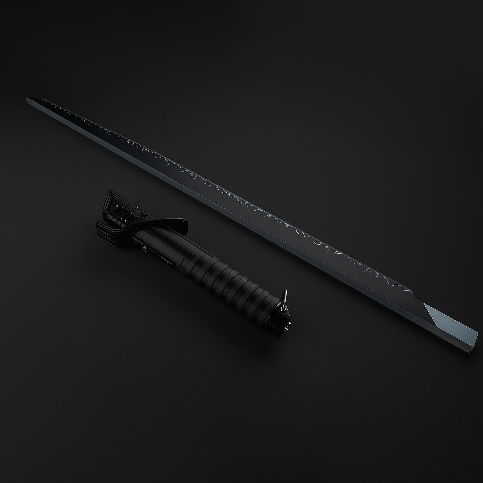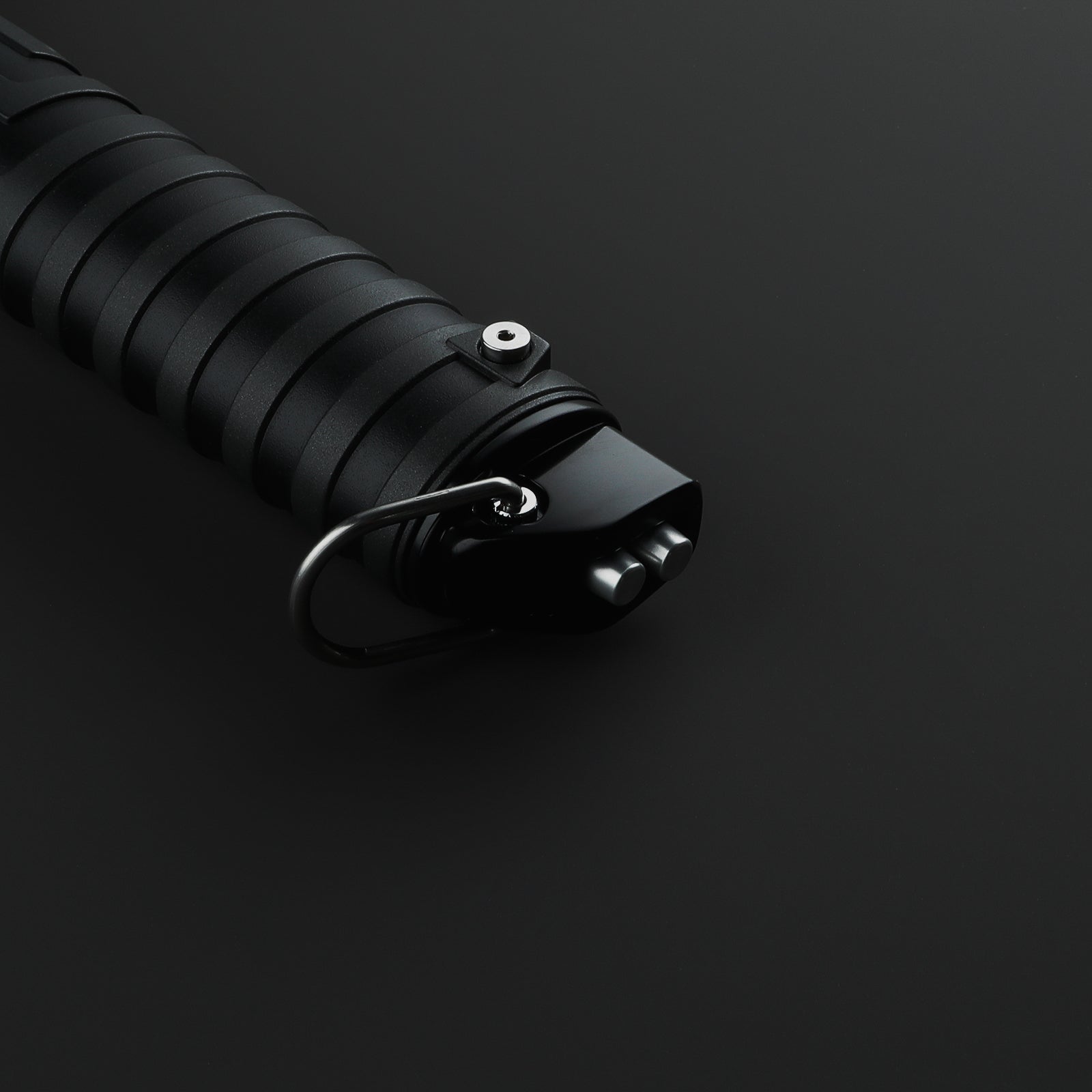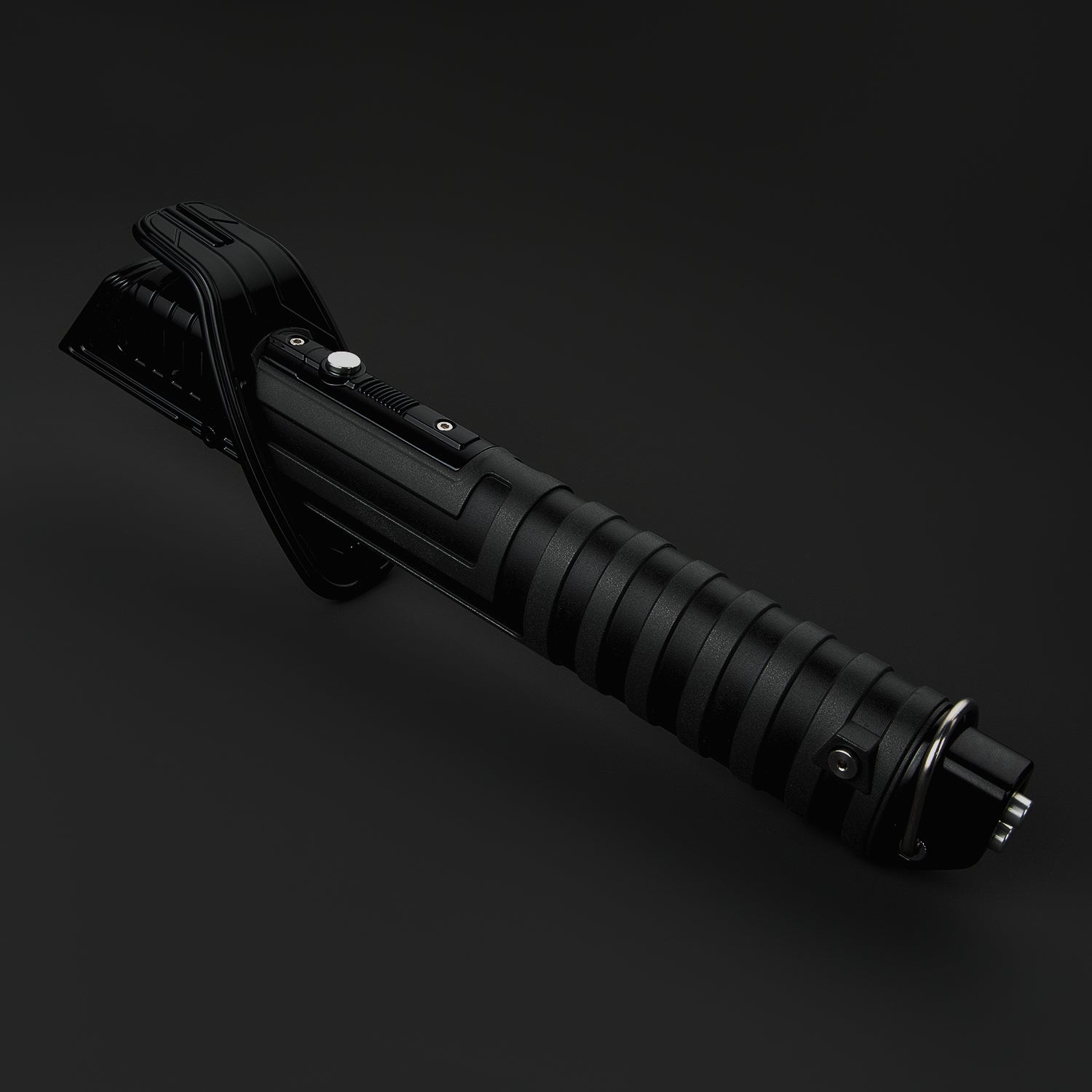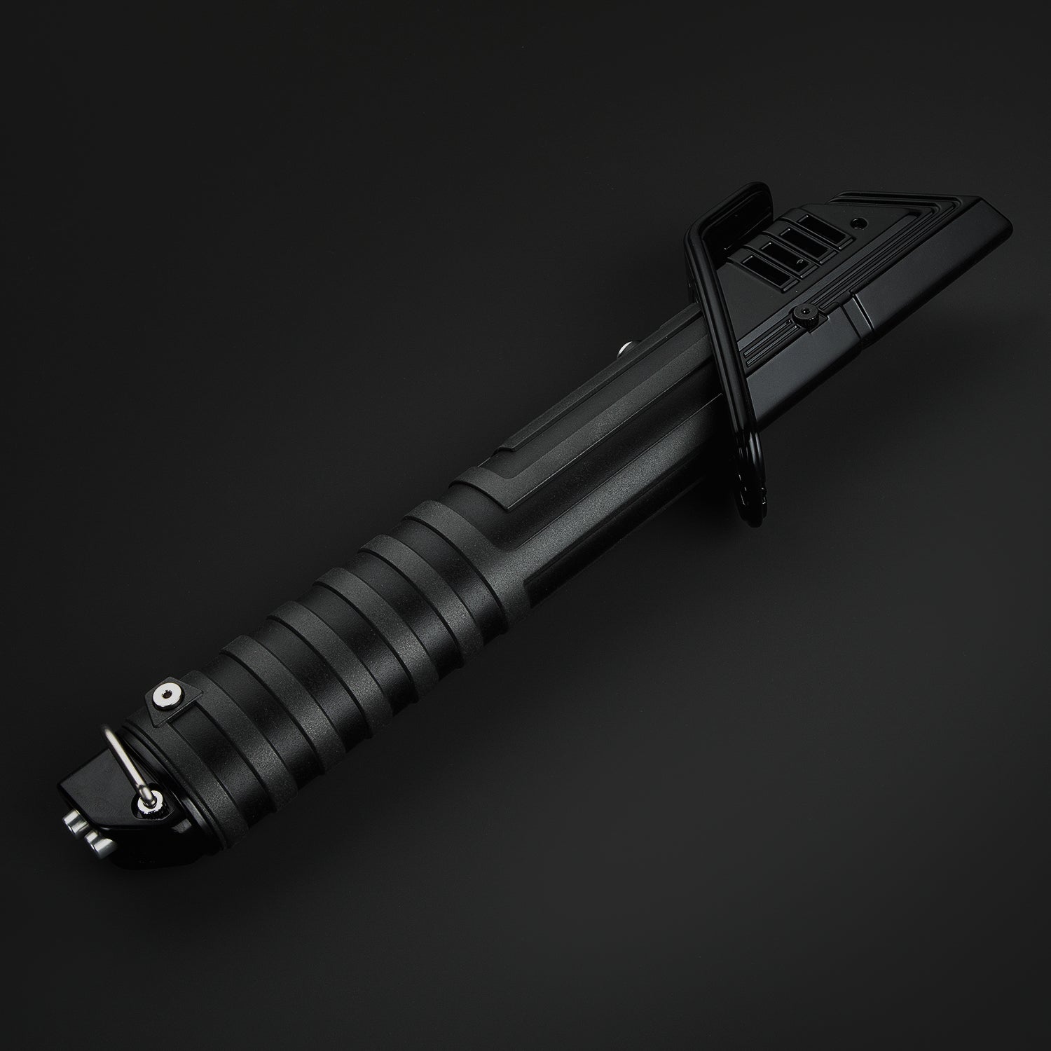 Saber Legacy se complace en ofrecer el Darksaber MKII, un sable que presenta un elegante cuerpo anodizado en negro matte, tsuba, pomo y emisor, con detalles plateados o desgastados en la empuñadura. Magníficos detalles fresados a lo largo de toda la longitud del sable añaden un toque de realismo y complejidad al diseño. El perfil del mango es increíblemente estrecho con solo 1,1 pulgadas y permite un agarre indexado como una katana real, lo que lo convierte en un sable cómodo y preciso. Se accede fácilmente al puerto de recarga quitando el pomo. Este sable solo acepta hojas de sable oscuras de perfil plano y viene con una hoja de perfil plano estándar.
